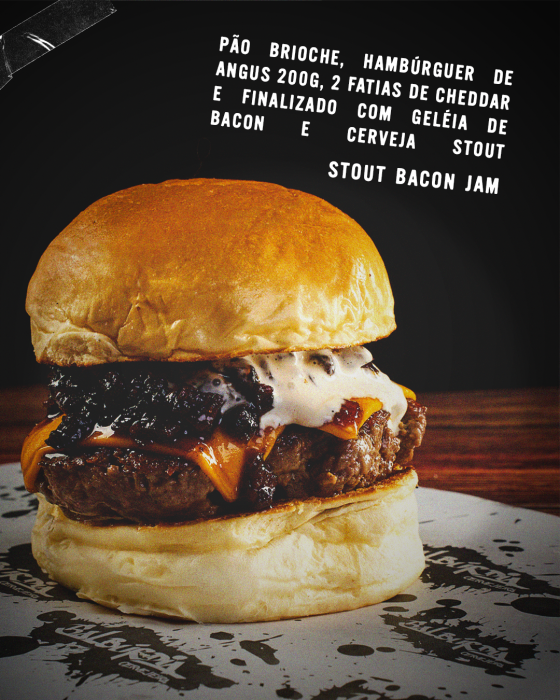Entre os burgers e sanduíches, o cardápio traz influências variadas, com opções como o Stout Bacon Jam, finalizado com geleia de bacon e cerveja stout, o Magic Mushroom, com cogumelos salteados e maionese de alho confit, o KFC coreano, além do burger de camarão (Ebi Katsu) e do fish burger com peixe empanado em panko.